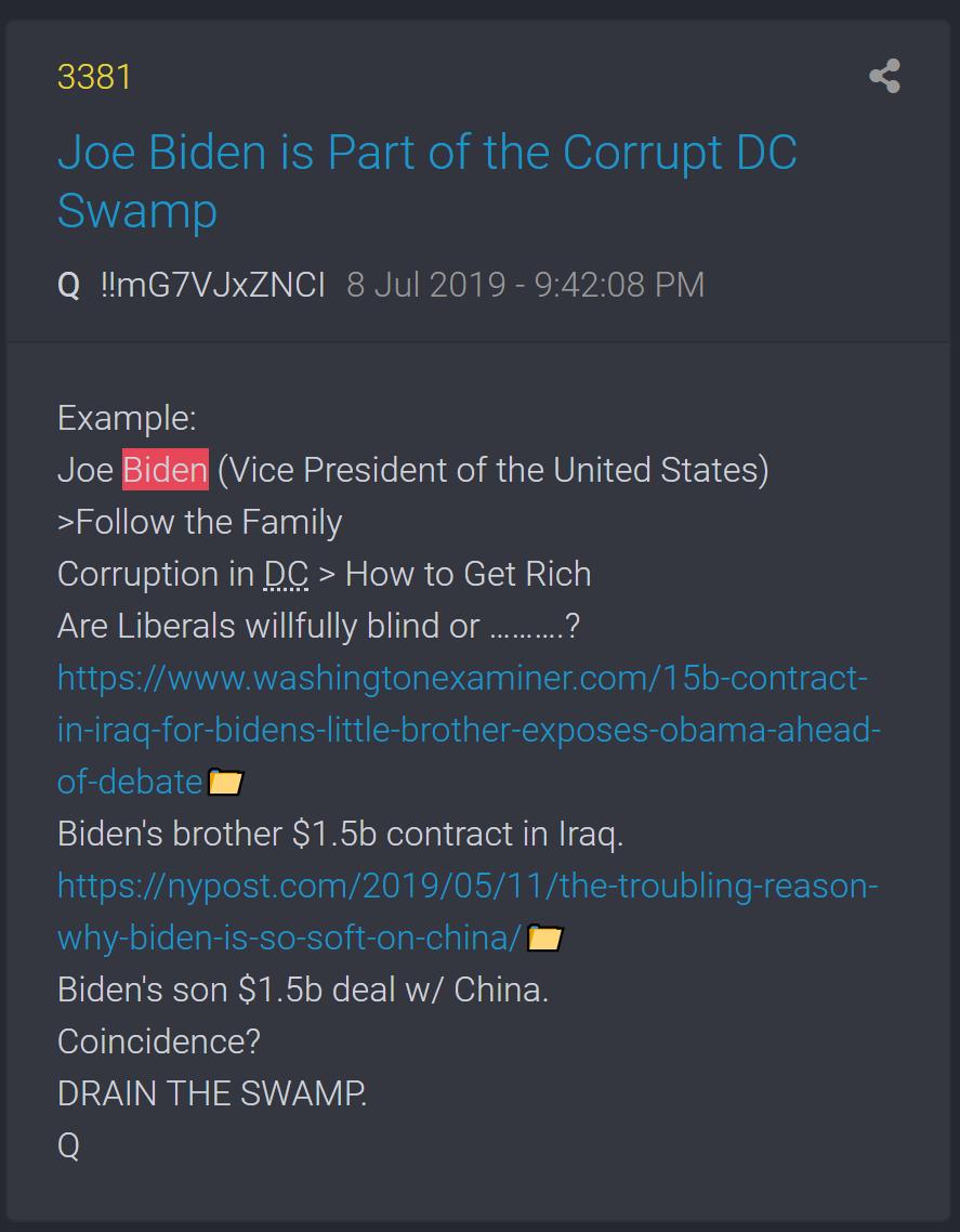 Q4906 ファミリーを 追え 2020年10月21日 カテゴリ:Qdrop by qajf_qmapjapan_pub Q !!Hs1Jq13jV6 ID: a95dd3 No.11192330 Oct 21 2020 13:35:45 (EST) NEWEFRvhYTXUAAo08y.jpg3381例:ジョー・バイデン(アメリカ副大統領)>ファミリーを 追えワシントンDCの 腐敗 > 金持ちになる 方法リベラルは 故意に盲目なのか それとも ..........?https://www.washingtonexaminer.com/15b-contract-in-iraq-for-bidens-little-brother-exposes-obama-ahead-of-debateバイデンの弟が イラクで15億ドルの 契約https://nypost.com/2019/05/11/the-troubling-reason-why-biden-is-so-soft-on-china/バイデンの息子が 中国と15億ドルの 取引偶然?沼を 掃除せよQ 「Qdrop」カテゴリの最新記事 < 前の記事次の記事 >
